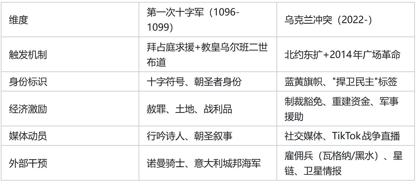 关键案例:2023年,美国众议院成立”中国问题特别委员会”,主席加拉格尔在首次听证会上宣称:”这是一场关于21世纪生活方式的斗争,自由世界必须获胜。”这一表述与1095年克莱蒙演说的结构完全一致:识别威胁(突厥人/中共)、召唤团结(基督教世界/自由世界)、承诺救赎(赦罪/历史进步)。