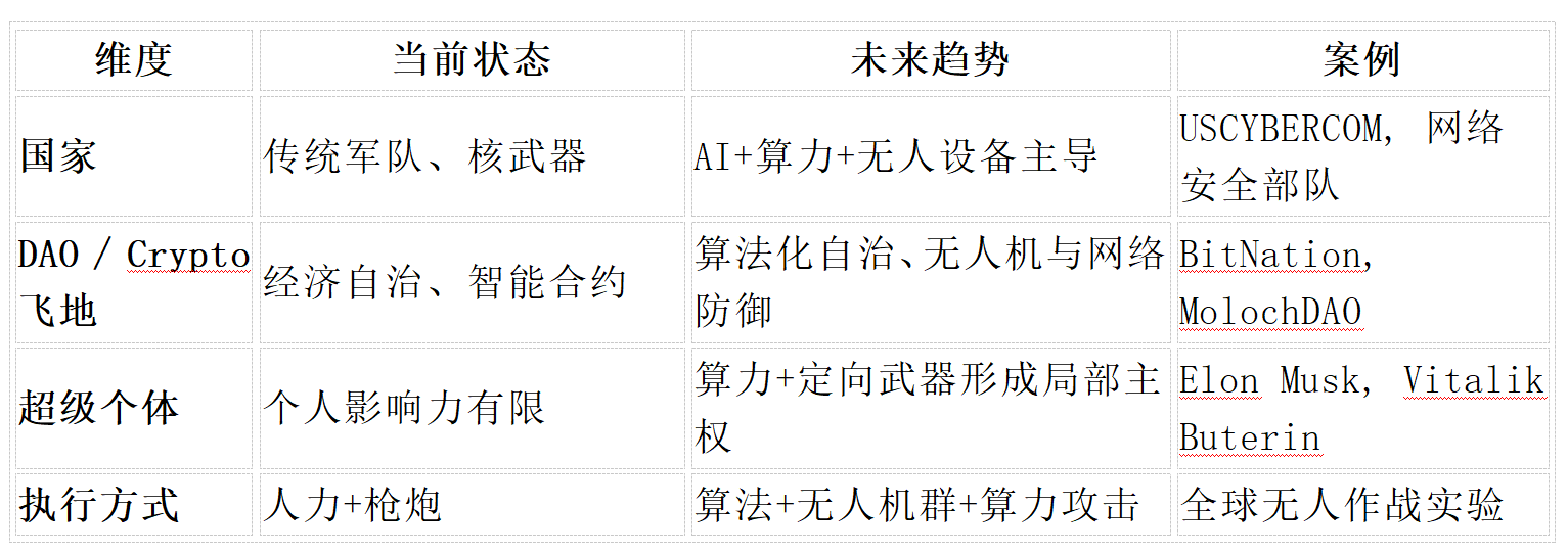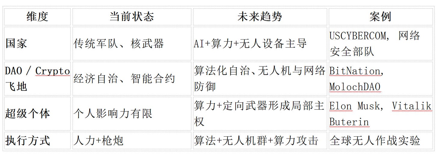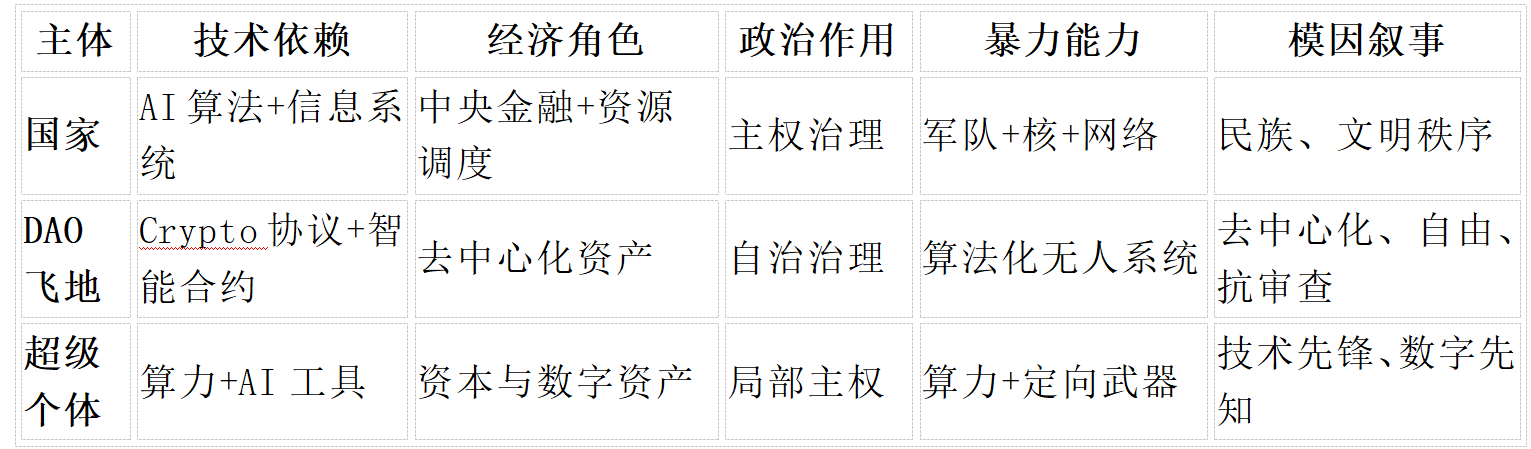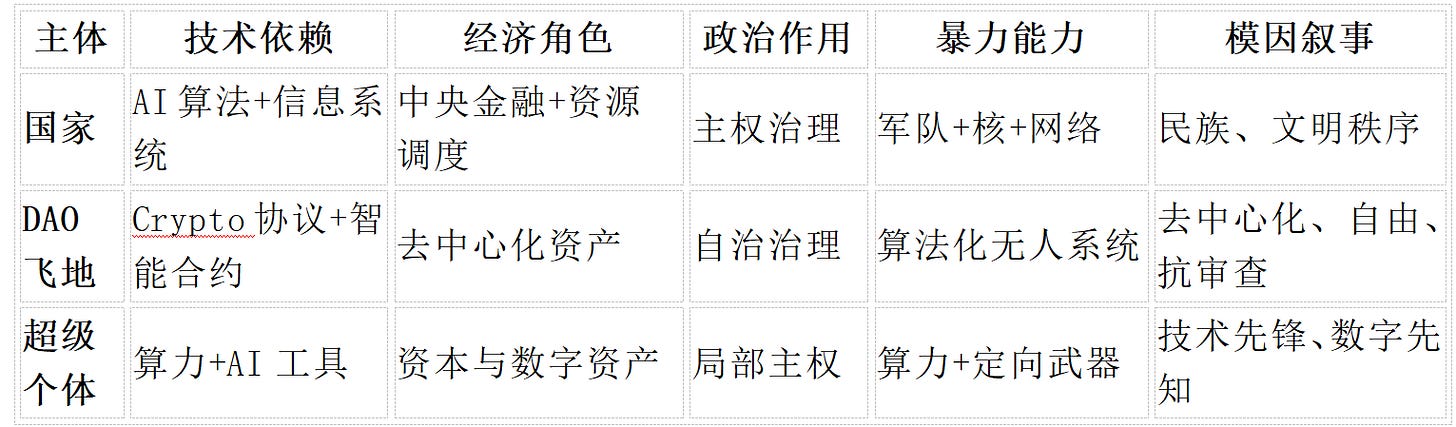 o 国家、DAO、超级个体共同存在,算法、网络、算力和叙事形成多层次权力平衡。