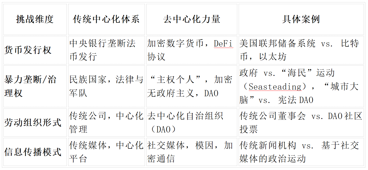 o 技术赋能少数超级个体,形成局部主权,国家与DAO作用下降。
