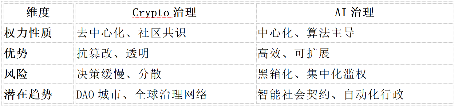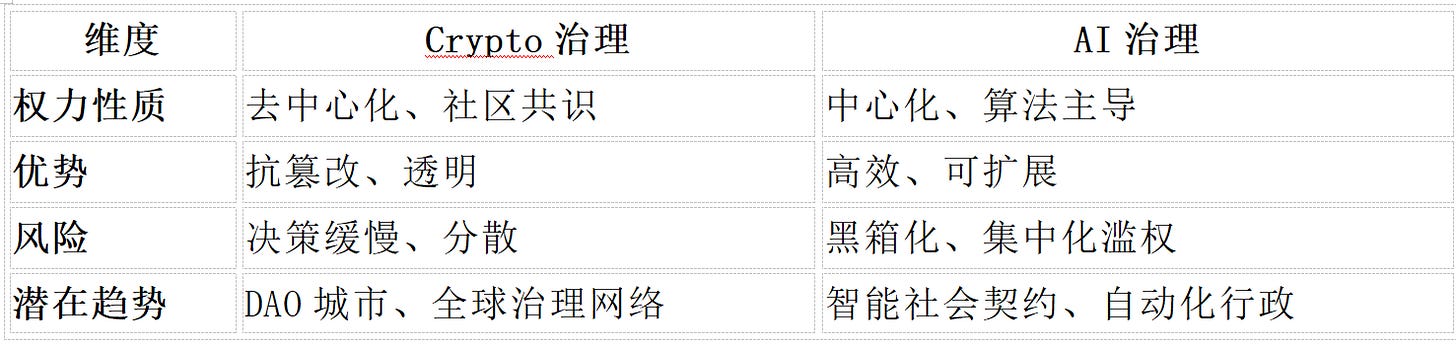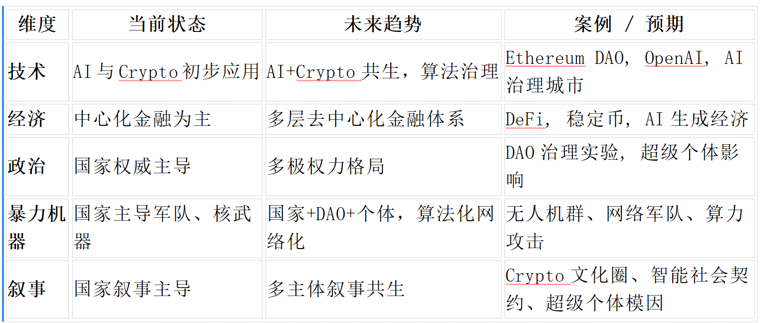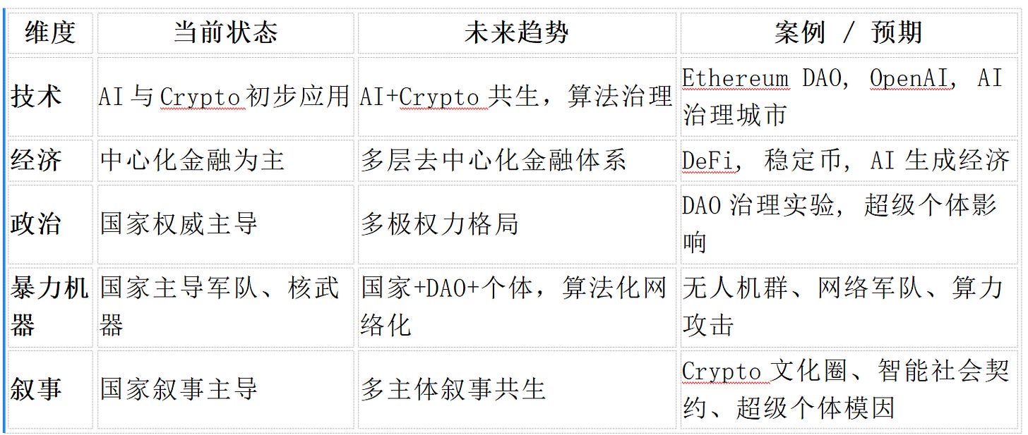 o Crypto与AI高度融合,形成去中心化自治经济+智能治理体系,国家与DAO共存。