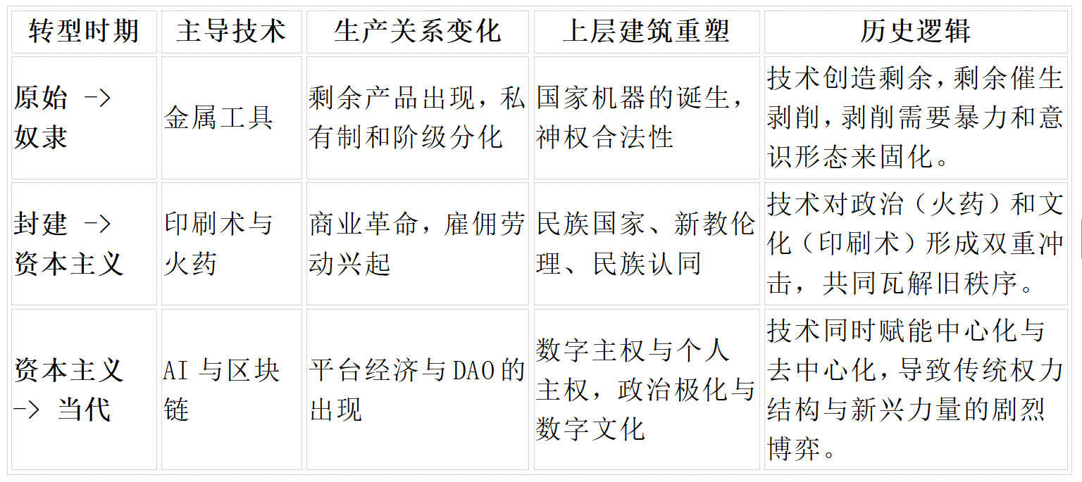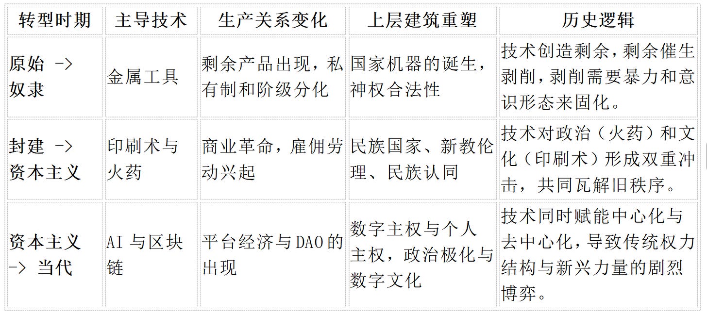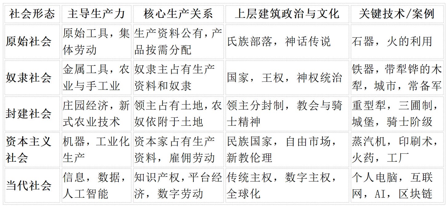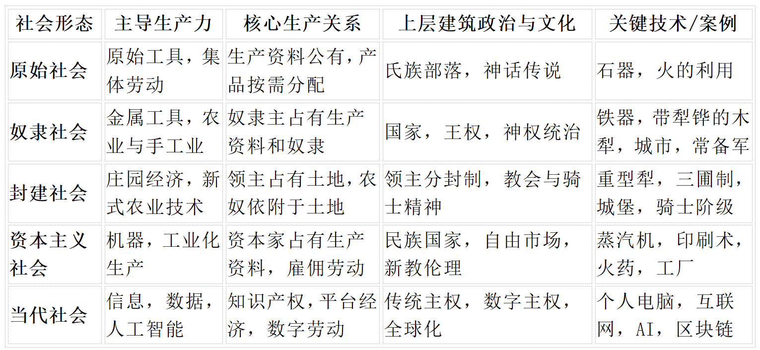回望从原始社会到当下的文明轨迹,“技术-经济-政治”的三角框架从未失效:石器催生部落公有制,青铜支撑奴隶制井田制,铁器孕育封建租佃制,蒸汽机引爆资本主义工厂,而数字技术正在重塑当下的资源分配——暴力机器始终跟着技术迭代,叙事则永远为政治权力合法性辩护。这种惯性既让文明在稳定中积累,也让变革充满阵痛。