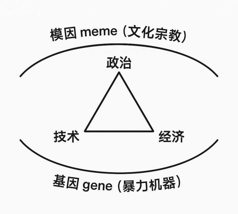 暴力机器始终作为隐形基底的基因gene,为秩序提供“执行保障”——从部落战士到核弹头,再到算法武器。而每个时代的文化叙事(巫术、宗教、启蒙思想等)模因meme则为其结构披上“合法性外衣”。
