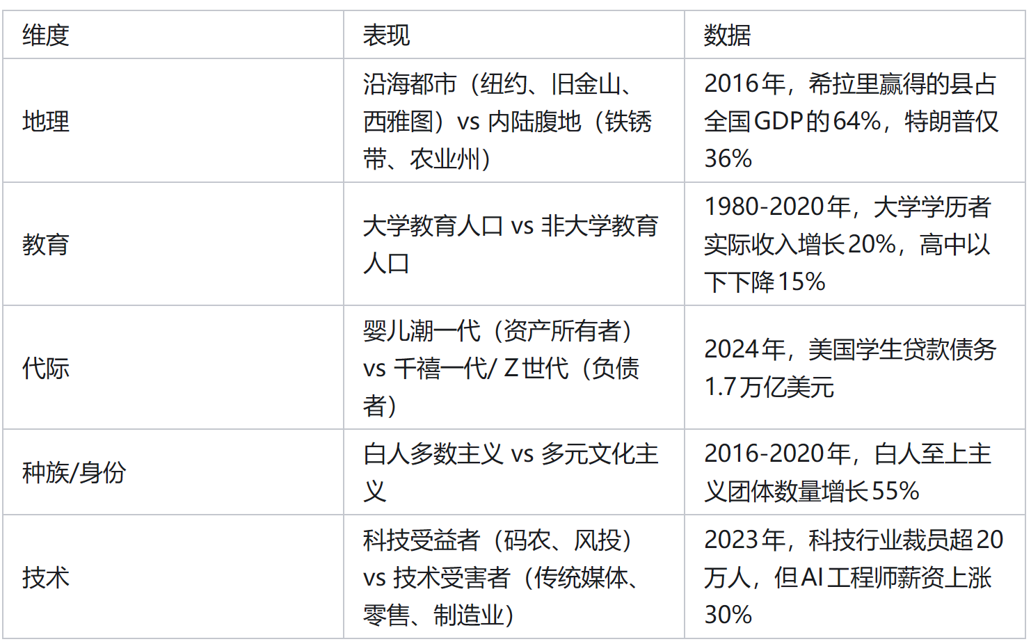 l 国内撕裂:2024年美国大选显示极化达到新高度,AI替代焦虑正在从蓝领向白领蔓延。