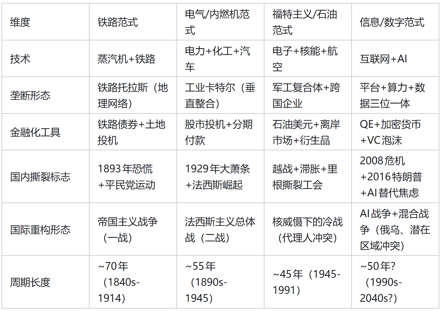 我们以美国过去150多年发展为主要研究对象,扩展到全球的历史发展周期,提出一个宏观历史模型:「技术范式 → 企业垄断 → 金融化 → 国内撕裂 → 国际重构」五阶段统一时间轴。该模型整合了康德拉季耶夫长波理论(Kondratiev Waves)、达利奥的大国生命周期、熊彼得的创造性破坏理论,以及关于资本积累与危机的洞见,试图解释过去150年四次完整的技术-周期循环,并指向未来10-15年的世界结构。
