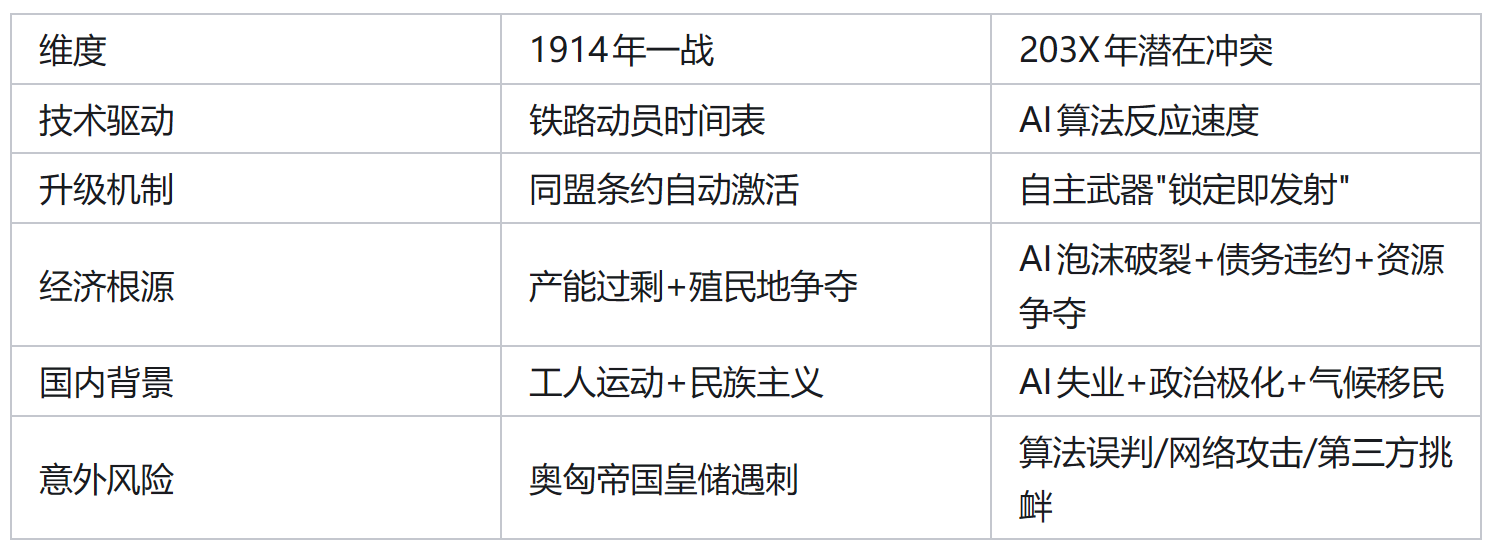 2032-2035年,AI驱动的误判或第三方挑衅(如朝鲜半岛核试验、南海主权争议)触发大国直接冲突。核威慑下的”有限战争”迅速升级为全球供应链崩溃,AI自主武器导致”算法末日”。